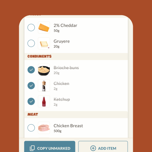 Auto-generated shopping lists based on the recipes you choose, so planning takes seconds.